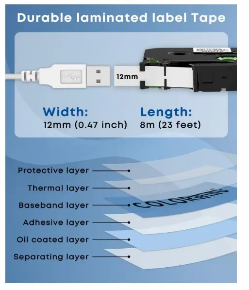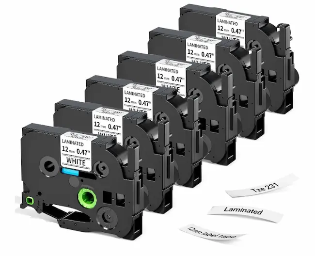 Paquete de 6 cintas para etiquetadoras Brother ptouch TZe-231 TZ-231 tze231, repuesto de cinta de etiquetas blancas laminadas de 0.47 pulgadas (0.472 in) Tamaño: 0.472 in (1/2 pulgadas) x 26.2 ft (26.2 pies). Color: estampado negro sobre blanco.