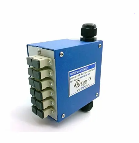 DINSpace SNAP Compact Fiber Optic Patch Panel with 6ea. OM1/OM2 Multimode SC/SC Duplex Adapters, UL/CE. Back or side compact fiber optic patch panel. DIN rail mount or surface mount with 2ea. cable glands. Max. cable diameter 0.472 in (0.551 in max. also available special order). Compact size allows for minimal space requirements inside control cabinets. Device includes a splice tray to allow standard fusion splicing of field wiring (pigtails sold separately). Device features a sliding faceplate with capture mechanism to allow the patch panel to be held open «hands-free». Relative humidity (non-condensing): 10% to 95%. Insertion loss: 0.3dB (Multimode) and 0.2dB (Single mode). Storage/transport temperature: -40 to +80 degrees.