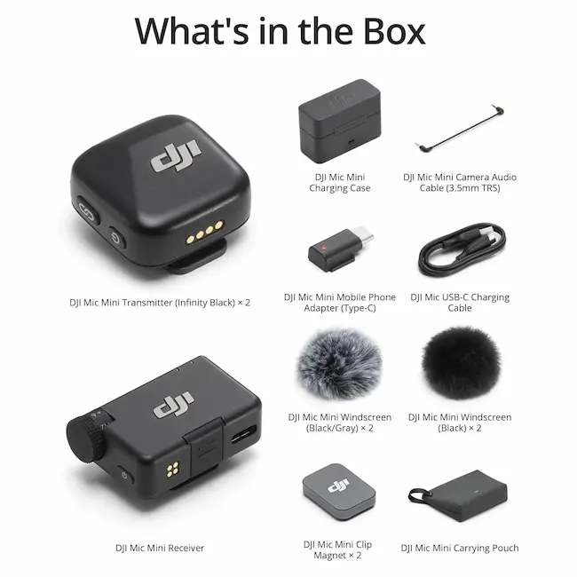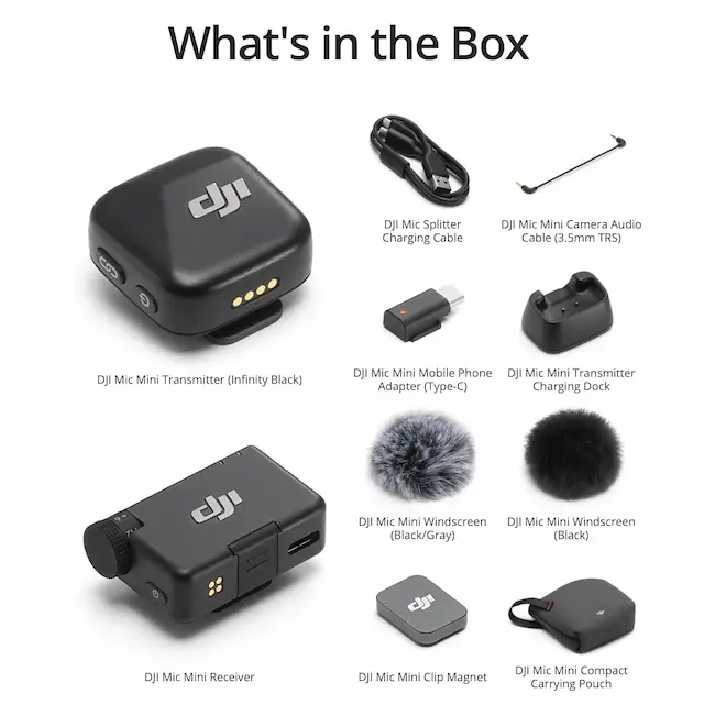 - Incluye dos DJI Mic Mini TX, un RX, un estuche de carga y otros accesorios, lo que lo hace optimizado para una amplia gama de escenarios extendidos como entrevistas, transmisión en vivo, creación de contenido y más.