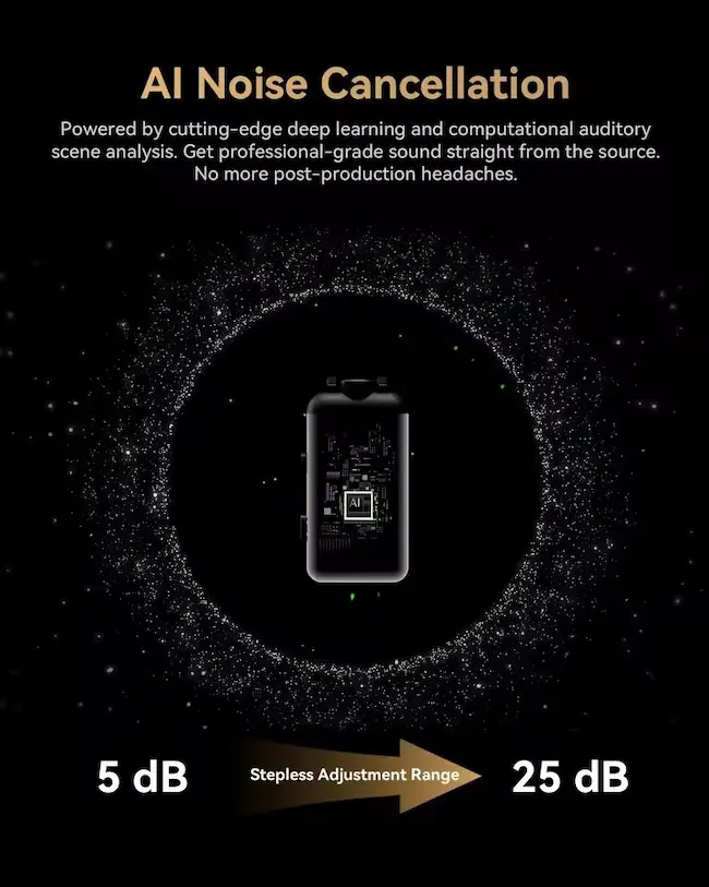 - AI-Powered Studio Clarity Pioneering deep-learning noise cancellation (5–25dB stepless adjustment) paired with 48kHz/32-bit float studio-grade recording ensures your wireless microphone captures vocals in pristine detail while eliminating background noise. Ultra-Low latency, zero clipping, and 128dB SPL deliver broadcast-ready audio for live streaming, podcasts, and pro recordings—ideal for high-volume environments.