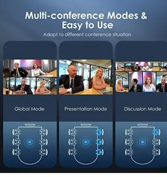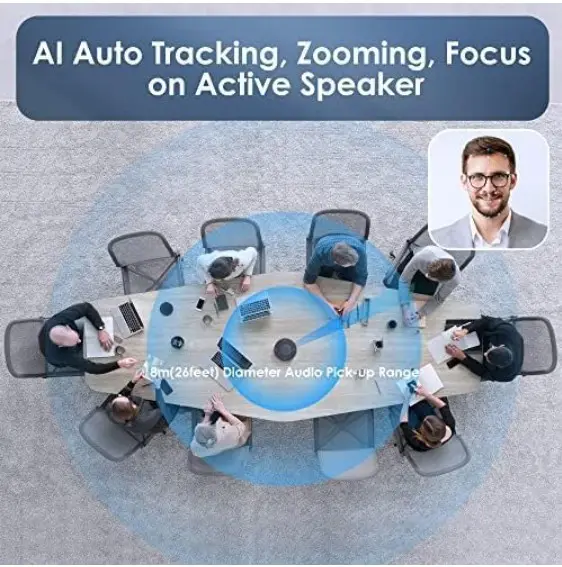 - [Todas las funciones en una, Plug and Play] – Los altavoces duplex completos integrados de 10 W eliminan el ruido de interferencia, un eco y transmiten un sonido nítido para que puedas escuchar a la otra parte con claridad. 8 micrófonos omnidireccionales captan la voz a 18 pies de distancia y filtran el ruido de fondo y el eco.