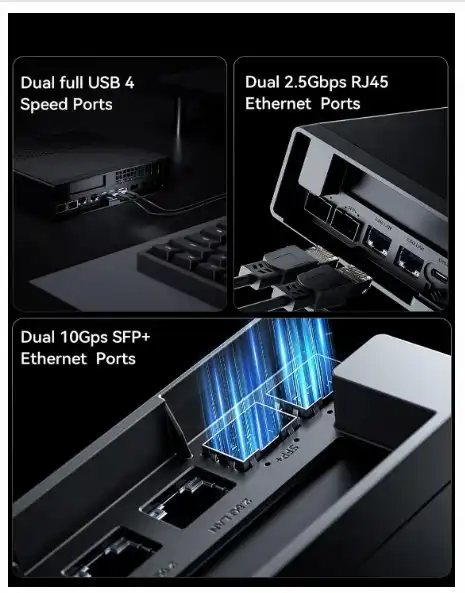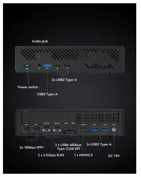 - 【Ultra Fast Connectivity】:Micro PC MS-01 is equipped with two 10Gbps SFP+ Ethernet ports. The SFP+ module provides high stability and fiber-optic transmission to prevent eavesdropping and interception, ensuring network security. The 10Gbps transmission speed is 10 times that of traditional 1000Mbps Ethernet, which meets the needs of high-performance network devices. In addition, to the two SFP+ network ports, the MS-01 is equipped with two standard 2.5Gbps RJ45 network ports, which deliver twice the transfer speed of a single 2.5Gbps port for improved network performance.