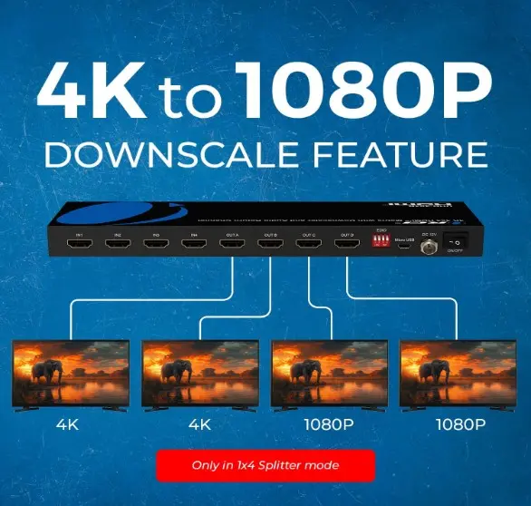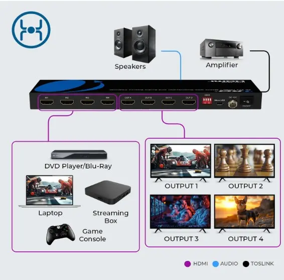 - Modelo 4x4R: 4 In / 4 Out • 4K@60Hz • Salida Audio Óptico/RCA • Soporte ARC