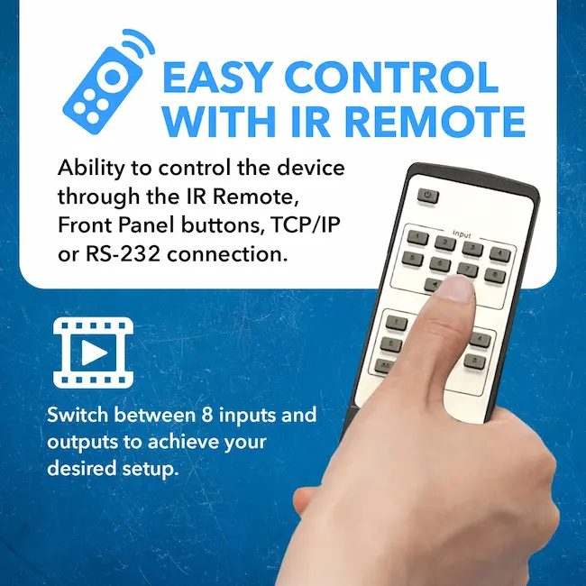 - Soporte al cliente completo – Incluye 1 unidad de matriz HDMI, 1 control remoto, 1 adaptador de corriente, 1 manual de instrucciones (idioma español no garantizado). Control. Control a través de botones del panel frontal, control remoto IR, RS-232, LAN y Web GUI