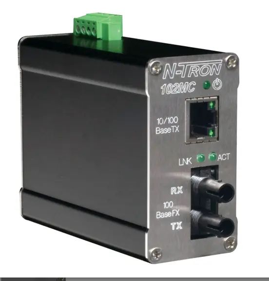 Manufacturer: Red Lion Controls Inc - N-Tron 2-port unmanaged Ethernet switch, one 10/100 RJ-45 and one 100Base-TX full-duplex fiber port. Provides one auto-sensing RJ-45 10/100BaseTX port and one 100BaseFX port. Utilizing «next generation» Ethernet switching technology. The 102MC auto-negotiates the speed and flow control capabilities of the TX copper port connection and self-configures. The 100BaseFX fiber optic port uses industry-standard ST or SC connectors and is configured for full-duplex operation. Unlike most media converters, the 102MC utilizes switching technology. This means that 10 Mbps devices can be connected today and upgraded to 100 Mbps devices later. The switching fabric simply scales up or down automatically to match specific network environments. Supports up to 2000 MAC addresses, allowing these products to support extremely sophisticated and complex network architectures. It allows you to take advantage of the inherent benefits of fiber-based infrastructure. Compared to copper-based systems, fiber provides greater noise immunity and longer cable lengths. The 102MC has expanded operating environmental specifications to meet the harsh demands of the industrial environment. For cost savings and convenience, the media converter can be mounted on a 35mm DIN rail alongside Ethernet I/O or other industrial equipment. The unique compact size provides a small footprint, conserving space in the most critical dimension. It can also be panel-mounted if desired. For increased reliability, the 102MC includes redundant power inputs. LEDs are provided to display link status and activity for each port, as well as power on/off status. 140 mA at 24 V input current, 8.5 Amp/0.7 ms at 24 V inrush. -40 to 80 degrees C operating and -40 to 85 degrees C storage temperature. 10 to 95 percent (non-condensing). 0 to 10,000 operating altitude. Maximum length of 1.2 mi. Network media: 50-62.5/125 micron. Measures 3-19/32 inches long by 1-1/2 inches wide by 2-115/128 inches high.