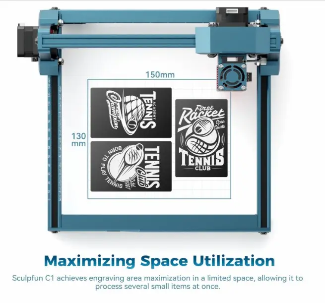 In spite of its mini size, the sculpfun C1 laser engraver offers a large engraving area of 150*130mm, maximizing the space utilization. It allows users to process several small items simultaneously. Additionaly, the precise scales designed on the frame provide clear reference points on the X and Y axis, which realize precise positioning for complex and detailed projects.