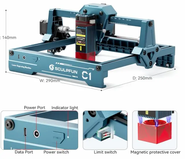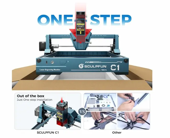 The Sculpfun C1 is an ideal choice for beginners. It comes pre-assembled with user-friendly features, which is ready to use right out of the box. This eliminates the hassle of assembly and guarantees a great user experience. Equipped with limit switches on the X-axis and Y-axis to ensure safety and provide an easy reset option.