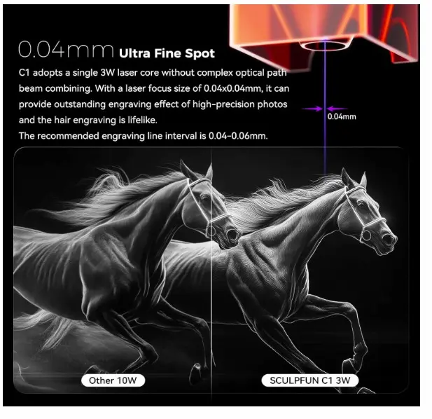 The C1 uses a single 3W laser core with an ultra-fine spot size of 0.04mm. The low power laser head maintains an ultra-fine laser output, enabling users to create detailed engravings on every piece.
